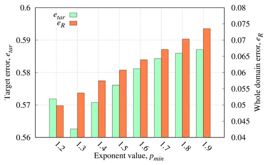 Relative reconstruction errors in all of the investigation domain and inside the target region versus the exponent range, defined by the parameter .