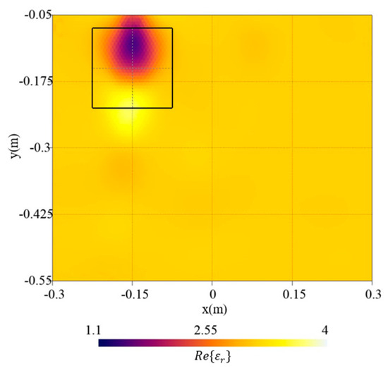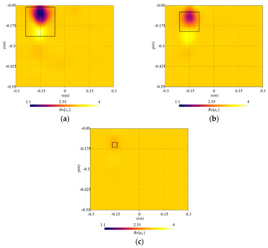 By comparing the results, as the depth increases [Figure 6 and Figure 9a,b], the target reconstruction shows a decrease in the accuracy of the dielectric properties up to the point where it is difficult to locate the object [Figure 9c].