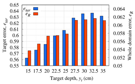 The reconstruction errors in the whole investigation domain and target region are shown in Figure 11. For low values of depth, the best target and whole domain error are achieved; then, by deepening the buried target, both the error in the target region and in the whole investigation domain has an upward trend. In more detail, beyond the depth of cm (), the detection of the object is more difficult, and the quality of the reconstruction deteriorates as evidenced by the error trend, which for cm shows .