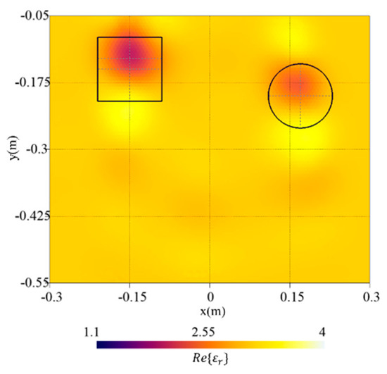 Figure 12 shows the reconstructed distribution of the real part of the dielectric permittivity together with the actual shapes of the targets. As can be noticed, both targets with different geometries are correctly localized, and although in the case of the object with a circular-cross section a slight underestimation can be observed, a quite good reconstruction is achieved. Moreover, by comparing the reconstruction of the square-cross section target alone [Figure 7b] and in the presence of a second object, a slight deterioration can be observed, due to the interaction between the objects. This is confirmed by the computed reconstruction errors in the target region and in the whole domain (i.e., and ), which are higher than in the single-target case (i.e., and ).