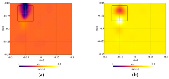 Reconstructed distribution of the real part of the dielectric permittivity, , in the investigation domain together with a square box indicating the shape of the actual target. Background dielectric permittivity in the inversion procedure: (a) underestimation () and (b) overestimation ().