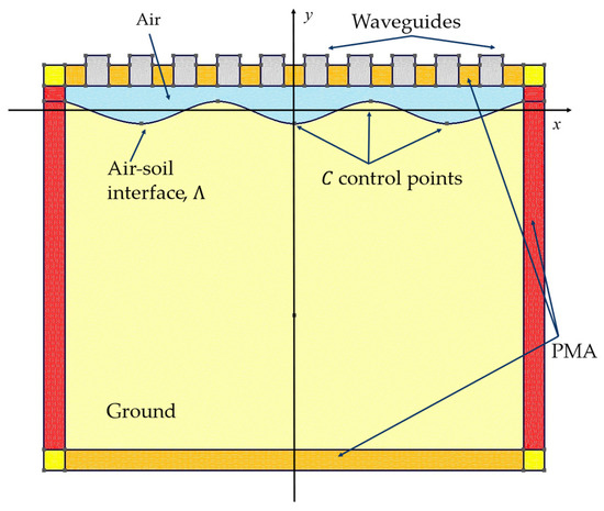 The first term of Equation (6) represents the incoming mode feeding the -th port and the second one represents the outcoming modes inside the th waveguide. For the solution of the forward problem, coefficients are left as unknowns, and the -parameters are then retrieved as . Moreover, in the analysed configuration, absorbing boundary conditions (ABC) are required to terminate the simulation domain outside the antenna ports. To this end, the perfectly matched anisotropic absorber (PMA) has been selected [56,57].
