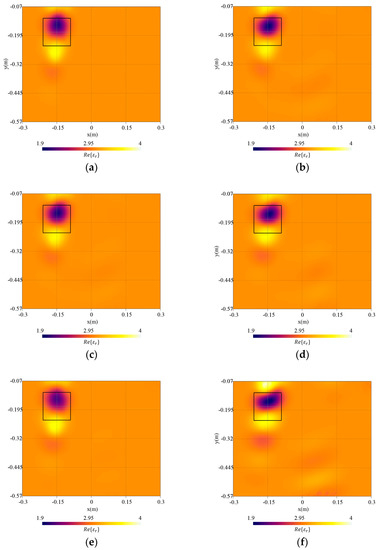 Reconstructed distribution of the real part of the complex dielectric permittivity, , in the investigation domain together with a square box indicating the shape of the actual target. Cases of surface with and inversion with (a) exact interfaces and (b) planar interfaces; and inversion with (c) exact interfaces and (d) planar interfaces; and inversion with (e) exact interfaces and (f) planar interfaces.