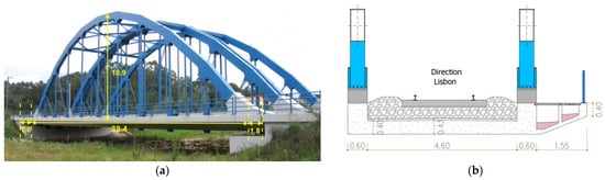 The São Lourenço bridge is located at km +158,662 of the Northern line of the Portuguese railways, which establishes the rail connection between the cities of Lisbon and Porto. The bridge’s structure consists of two half-decks with a span of 38 m that support each of the railway traffic lanes. Each half-deck consists of a prestressed concrete slab, with 0.40 m thickness, laterally suspended by two metallic arches. The suspension of the slab is carried out by means of metallic hangers and diagonals close to the start of the arches. Figure 1 shows a lateral view of the São Lourenço bridge and a cross-section of a half-deck in a section close to the start of the arches.
