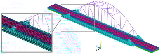 Regarding the bridges, they are usually modeled through the finite element (FE) method using three-dimensional (3D) elements to model both the structure and the track [2,3]. These models can accurately reproduce the behavior of the track–bridge coupling system, independently of its complexity, since the several components of the bridge (deck, bearing supports, piers, and foundations) and track (ballast, sleepers, pads, fasteners, and rails) may be modeled using different types of FEs (beam, shell, or solid) and connecting elements (rigid links and spring–dashpot assemblies). The inclusion of the ballasted track in the numerical models of the bridges has several advantages, since this approach (i) guarantees the adequate train loads distribution, (ii) filters high-frequency content from the bridge’s dynamic response, (iii) incorporates the track–bridge composite effect due to the longitudinal shear stress transmission occurring between rails and bridge deck, through the ballast layer, and (iv) simulates the track continuity between neighboring decks and between the deck and the embankment [10,11,12,13].