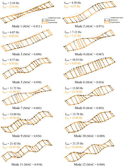 Figure 3 shows a comparison of the main global modal configurations of the bridge obtained experimentally and numerically. The configurations refer to transversal bending modes of the arches (1, 4, and 8) and bending (2, 3, 5, 9, and 11) and torsion modes of the deck (6, 7, 10, and 12). To simplify the graphical representation, only the points belonging to the deck are presented. In the same figure, the values of the numerical (fnum) and experimental (fexp) natural frequencies and the values of the parameter MAC (modal assurance criterion), indicating the degree of agreement between numerical and identified mode shapes, are also listed. The results showed a very good agreement between numerical and experimental modal parameters. The average error of the natural frequencies was 1.88%, and the average value of the MAC parameter was equal to 0.908.