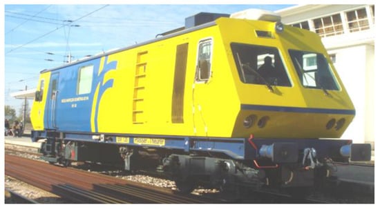The information about track irregularities was obtained through measurements by the EM 120 track inspection vehicle from the Portuguese infrastructure manager IP (Figure 4). This vehicle measures the longitudinal leveling of the track as a function of the measurement of the distance from the head of the rail, using a laser system installed on the bogie.
