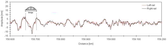The irregularity profiles measured on both rails were practically coincident. In most of the length of the track section, the amplitude of irregularities on both rails did not exceed 5 mm. The maximum amplitude of irregularities was around 12 mm and occurred close to the midspan of the bridge. The measured irregularities, either in terms of peak value or in terms of standard deviation, were within the limits indicated in the standard EN 13848-5 [49].