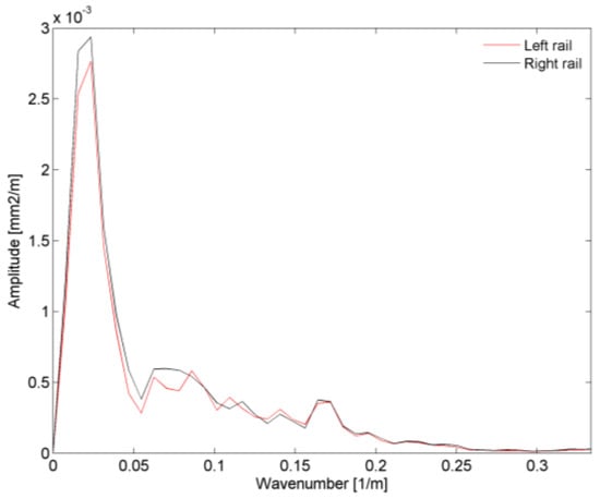 Amplitude of the power spectra of the irregularities, as a function of the wave number, on the left and right rails.