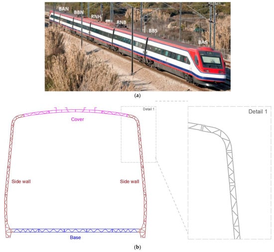 The carbody is formed by a tubular structure in aluminum alloy, made up of welded honeycomb-type panels. The main structure of the bogie, called a chassis, is made of mild steel and consists of two stringers that are connected by means of two tubular beams, forming a double H structure. The bogie chassis is supported on two axles by means of primary suspension springs and dampers. Figure 7b shows a cross-section of the carbody with the identification of its main constituents: base, side walls, and cover.