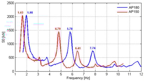 Figure 8 shows the graph of the dynamic signature of the Alfa Pendular train, as a function of the excitation frequency, for operating speeds of 150 km/h (AP150) and 181 km/h (AP181). These two speeds were the running speeds recorded in the dynamic test under traffic actions (Section 5). The speed of 150 km/h was recorded during maintenance works on the track, close to the bridge. The dynamic signature of a train translates the dynamic excitation of the train and depends only on its geometric characteristics, in particular axle loads and distances between axles, which can be obtained as follows: