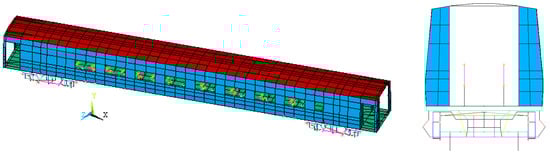 The numerical model of the BBN vehicle was developed in the ANSYS software version 12.0 [46], consisting of a three-dimensional finite element model including the carbody, bogies, and passenger-seat system. The use of a numerical model based on the finite element method allowed us to consider the influence of the deformability of the various vehicle components. Figure 9 shows a perspective and a cross-section of the model.