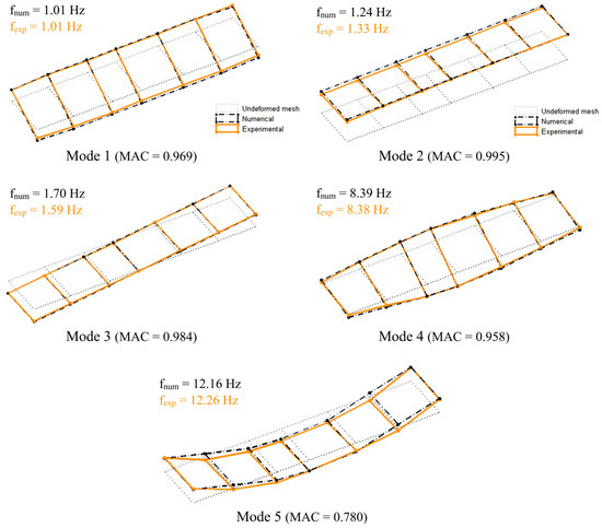 Comparison of the global vibration modes of the bridge obtained experimentally and numerically.