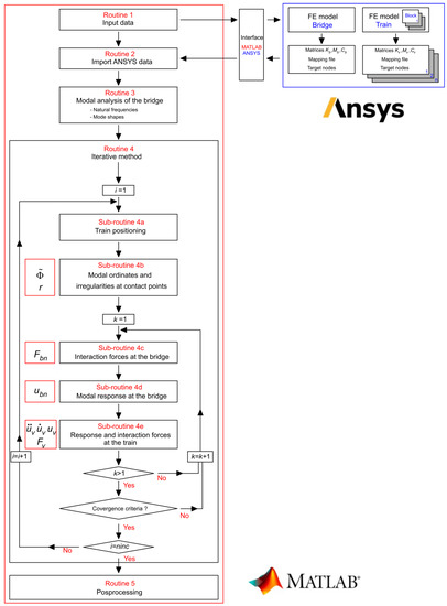 The main structure of the program consists of five routines, involving the input data (Routine 1), the import data from the ANSYS software (Routine 2), the modal analysis of the bridge (Routine 3), the solution of the train–bridge dynamic interaction problem through the iterative method (Routine 4) and the output of results (Routine 5).