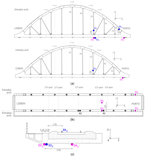 Measuring points in the dynamic test under railway traffic: (a) lateral views of the arches (extrados and intrados); (b) plan view of the deck; (c) deck cross-section (between 1/3 and 1/4 span).