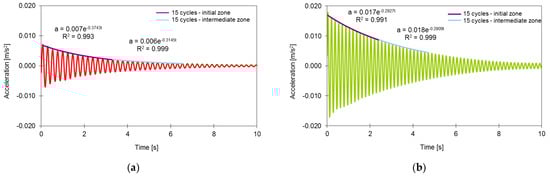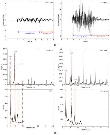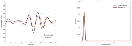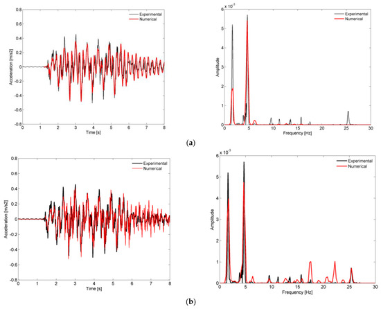 Figure 20 shows a comparison of the time records and the respective auto-spectra of the vertical acceleration on the deck (location A1), obtained experimentally and numerically, for the passage of the Alfa Pendular train at a speed of 150 km/h. Numerical results were obtained considering a train–bridge interaction methodology, without and with the inclusion of the irregularities, as presented in Figure 20a,b, respectively.