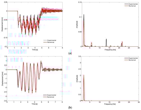 The figures show a very good agreement between the experimental and numerical records. This agreement is visible for both the forced vibration and the free vibration movements. Regarding the frequency content, the amplitudes of the response peaks associated with the loading (1.98 Hz, see Figure 8) and mode 3 (5.91 Hz) were matched with the amplitudes of the experimental peaks. The peak associated with mode 12, with a frequency greater than 20 Hz, and whose shape represented the bending of the deck with movements of the supports, was also quite close to the peak identified experimentally. The contribution of mode 9 (13.48 Hz), a deck torsion mode that appeared in the experimental response, was not identified in the numerical frequency response. This effect was probably associated with some slight eccentricity in the application of the train loads, due to some unbalance between the left- and right-handed wheels, which caused the torsion of the deck. This effect was not captured in the numerical model where balanced axle loads were considered.