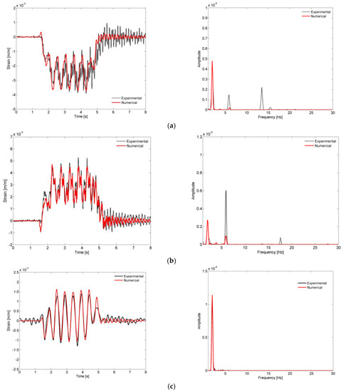 Comparison of strains records and respective auto-spectra for the passage of the Alfa Pendular train at a speed of 180 km/h, obtained experimentally and numerically, from locations (a) S5, (b) S1, and (c) S4.