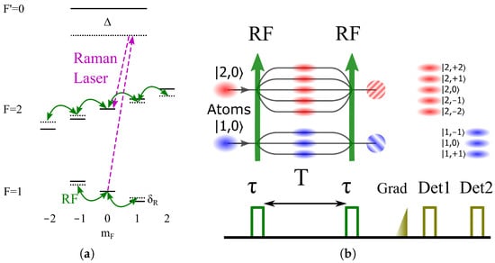 The level scheme and the sequence of the dual atom magnetometer are depicted in Figure 1. The sequence starts with a cold atom ensemble containing and states. This can be achieved by adjusting the repumper (for the transition) parameter as the intensity or duration, or in a coherent way by employing microwave or Raman transition between and states. The fraction of atoms in and systems form the two-atom interference magnetometers (AIM). We use the RF signal to perform Ramsey interference [44] between spin levels and then realize spatial separation by a magnetic field gradient pulse. The atoms of are detected first by resonant absorption imaging. After that, assisted by a microwave or Raman [45] pulse to probe atoms in one specific state, the interference fringe in the system is detected. Similar to the Ramsey interference in a two-wave system, in a multi-wave system, in our case, the relative phase shift between the RF signal and the magnetic-field-induced phase during evolution time T pushes atoms to one or the other levels, producing the fringes that can be read by the second RF pulse.