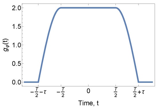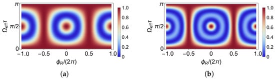 In the case of , same as in system, two pulses produce a bright fringe center. Different to the case in , the fringe center with two pulses is no longer a zero population point. According to Figure A1d and the component in Equation (A10), the full population inversion occurs when . Therefore, we set as , noted as , to produce a dark fringe center. Phase behavior of pulse area of , and are listed in Equations (4)–(6) and plotted in Figure 5.