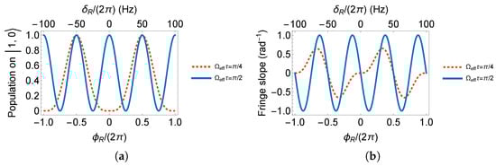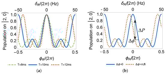 In the system, according to Figure A1b, a pulse spreads all atoms to states. Observation on output will present a zero population. If we set the pulse area to , a minimum as a dark fringe is expected at the Ramsey fringe center, where the interferometer phase is zero. On the contrary, in Figure A1b, a pulse recovers the full population on . If we set the RF pulse area to , a maximum as a bright fringe is expected at the Ramsey fringe center. The interferometer phase behavior on is expressed in Equations (2) and (3) and plotted in Figure 4. The evolution time T is set to for demonstration.