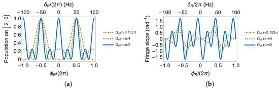 There are several features in Figure A1. First, not all the states are linear transformations of the sine function, especially in the h system. In the case of , the eigenvalues of are 0, and . The evolution is complicated by the wave frequencies and high harmonics in wave functions of the different matter. Second, when the initial state is a side state, only the two opposite side states have a full population inversion. The pulse area needed for the inversion is and one cycle is . Meanwhile, although the center state does not reach a complete population inversion, the periodicity is two times as fast as that of the side states. Third, if and only if the atoms are prepared in the center state, their evolution frequency is doubled and a complete population inversion is kept. The pulse area for one cycle is instead of . The last feature is important for producing an interference fringe with full contrast and with a high fringe slope in an atom interferometer. The fringe slopes in the next section prove this feature. The highest fringe slope can be obtained when preparing an initial center state.