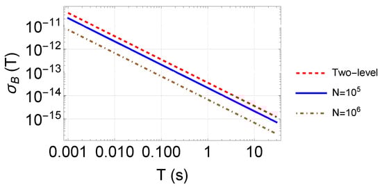 The sensitivity function for phase noise in Figure 9 is two times that in a typical two-level system [43] because the phase evolution is doubled, as in Equation (3). This maintains consistency with the fringe slope result in the previous section. Equation (9) is the exact phase noise sensitivity function in the system. For the system, the resulting sensitivity function can be approximated by scaling the fringe slope or can be calculated from scratch with Equation (8).