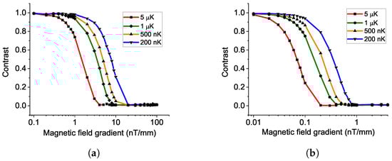 From the result in Figure 8a, setting the free-falling time as , with an atom temperature of , to keep the contrast higher than , the magnetic field gradient is required to be less than . The colder the atom temperature, the higher the tolerance to the B field gradient. This effect is more obvious for higher free falling time. In Figure 8b, for an atom temperature of , with free falling time of , the B field gradient is required to be lower than . In a metal vacuum chamber, with a conventional cooling technique such as optical molasses reaching 1 K, a magnetic field gradient such as [52] can wash out the interference fringe for free falling time, reaching the level of .