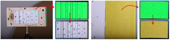 An indoor environment was chosen for image acquisition for both types of artifacts. A Canon 5D DSLR camera with a Canon 70-300 f/4-5.6L IS USM zoom lens was used, and the captured images had a size of 8688 × 5792 pixels. The sensor pixel size was 4.14 m and a focal length of 260 mm was used. The lighting was provided by two Elinchrom 4RX flashlights. The exposure time was set to 1/200 s so problems of blurring caused by vibrations were prevented and the F-stop was f/20, so all the surface of the imaged artifacts was in focus.