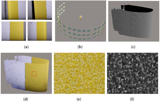 As we want to introduce a baseline that would represent the best possible case for SfM, we choose to go with the ContextCapture SfM reconstruction software by Bentley [56]. It provides very high accuracy while still being sensitive to sub-optimal capturing and object surface conditions [32]. It was chosen instead of other open-source alternatives, as they provide a more mixed performance, depending on the capturing environment, which would introduce noise and uncertainties in the proposed analysis pipeline. This way, the influence of the artifact textures and surfaces on SfM can be better captured. Figure 3 represents the SfM reconstruction pipeline as well as extracting and rasterizing patches. Initially, all the images for a single artifact were imported in ContextCapture Figure 3a. The 2D features from these images were then extracted, matched, and the ones deemed noise were discarded. From these feature matches, the 3D positions of points in a sparse point cloud, together with initial camera positions were calculated, as seen in Figure 3b. Next, the sparse points and camera positions were used to calculate depth maps for each image, which in turn were utilized to densify the point cloud and bring back additional details and calculate colors for each 3D point, as seen in Figure 3c,d. The resultant point clouds have arbitrary scales, so to establish the absolute real-life scale, the reference lengths on the artifacts were used. For the foam artifacts, the scale was fixed using the distance between a set of feature points on the surface. For the step-height artifact, the length and width of the artifact were used to fix it to an absolute scale.