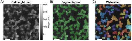 The initial image segmentation was conducted in four steps. First, the topographic map was filtered to remove low-frequency components. A Gaussian filter with a 5 mm cut-off wavelength was applied using the SPIP software. Secondly, an adaptive thresholding segmentation of height structures and background was performed using the MATLAB image processing toolbox. For each pixel, the segmentation finds a threshold level from a local neighborhood analysis. Thirdly, a modified watershed algorithm for irregular features from the Biovoxxel toolbox [63] in ImageJ was applied to label individual particles in a label map. For the algorithm, a convexity level of 0.95 was used. Lastly, using the label map, each individual particle could be selected from the topographic map. In Figure 4, the segmentation process is illustrated.