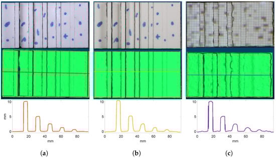 Qualitatively, the influence of the color contrast is visible in the middle and bottom rows of Figure 5. A much larger variation in width is observed with the projected light pattern of Figure 5c (middle panel) than for the marked pattern in Figure 5a. In addition, while the line profile of the marked pattern reconstruction in Figure 5a (bottom panel) shows almost rectangular side walls and step corners, the side wall and corner angles are reduced in the line profile of the projected pattern in Figure 5c. This indicates a loss in the resolution and accuracy of the reconstruction. A somewhat similar effect is seen by increasing the range from 1.5 to 2 m as seen by comparing Figure 5a,b.