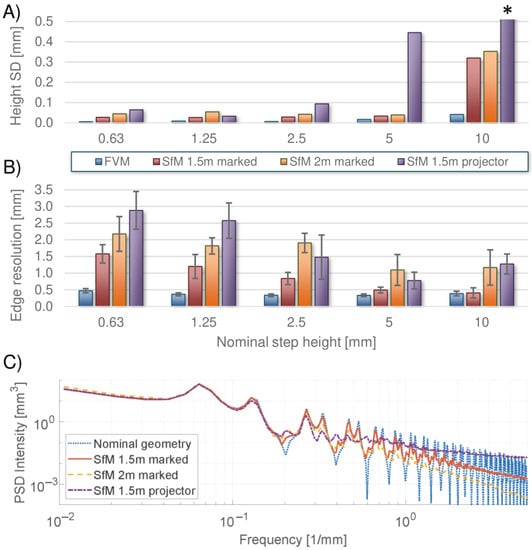 Step height artifact parameters from FVM, SfM marked pattern at 1.5 m and 2.0 and SfM projected pattern at 1.5 m. (A) SD of measured step height. Note that the SD of the 10 mm step of the SfM projected pattern was cropped off at 0.5 mm for better visual comparison. (B) measured ER with the SD as errorbar. (C) Power spectral density (PSD) analysis of the full reconstructed step-height artifact. Both intensity and frequency are shown on a log-scale. SfM measurements are compared to a nominal PSD based on the design geometry.