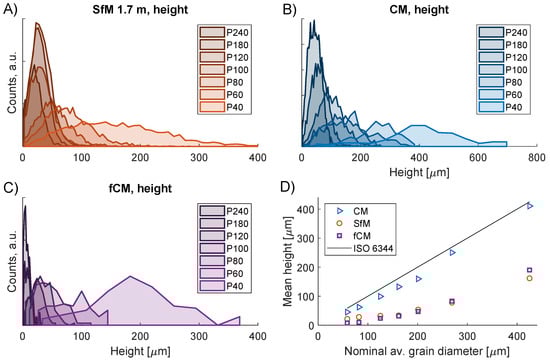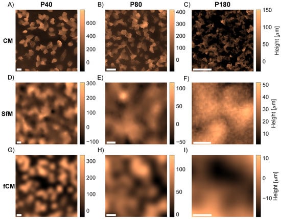 For the particle analysis, the limited spatial resolution of the SfM DEMs meant that the grains could not be resolved individually. Instead, groups of neighboring particles were observed as illustrated by comparing fCM topographies in Figure 8G through Figure 8I to CM in Figure 8A through Figure 8C. In addition, the resolution was also found to affect the measured heights. While the CM particle size distributions in Figure 9B range from 0 to 600 m, both the SfM of Figure 9A and fCM distributions of Figure 9C lie in the range from 0 to 400 m. Nonetheless, the particle analysis demonstrated that the fCM data also quantitatively gave a better description of the SfM topographies. Figure 9D shows that the mean particle heights are also fairly comparable for fCM and SfM albeit with some discrepancies for grits P40, P180 and P240. Since the CM values were in good correspondence with the nominal grain sizes, this supports that the smaller height values found by the SfM were due to the limited lateral resolution.