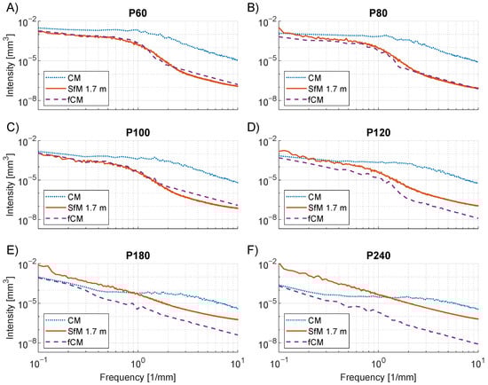 PSD analysis of CM (dotted line), SfM at 1.7 m range (full line), and fCM (dashed line) topographies of sandpaper artifacts of grit sizes P60–P240. The average of 1D PSD curves for each line in the DEM is shown on a log–log scale. (A) P60. (B) P80. (C) P100. (D) P120. (E) P180. (F) P240.
