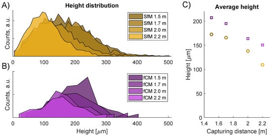 Figure 11 shows the height distributions from the particle analysis of the P40 grit. In Figure 11A, the SfM height distributions at varying range are shown, while Figure 11B shows the height distributions of the modeled fCM data. With increasing range, the height distributions are seen to shift toward lower height values. A similar behavior can also be seen for the increasing filter width. However, although the same trend is observed, the fCM mean height values are larger than the SfM values as shown in Figure 11C.