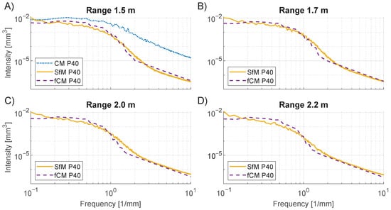 For the P40 sandpaper artifact, SfM measurements at four different distances were conducted at ranges of 1.5 m, 1.7 m, 2.0 m, and 2.2 m. As the range is increased, a proportionally larger spatial resolution should be observed. To include this effect in the modeled fCM data, the P40 CM measurement was filtered using Gaussian low-pass filters of increasing filter size. Thus, a value of proportional to the range was applied giving a of 0.19 mm, 0.21 mm, 0.25 mm and 0.27 mm.