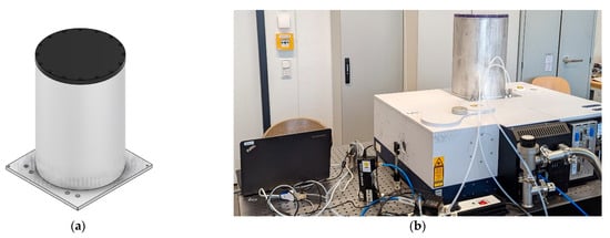 (a) CAD model of the designed lid. An aluminum cylinder (250 mm × 15 mm × 360 mm) with a polycarbonate plate (250 mm × 15 mm) was fixed with screws to a rectangular aluminum plate (282 mm × 293 mm × 10 mm). (b) Measurement setup with the lid fixed to the FTIR spectrometer with the long-path gas cell inside. The gas inlet was connected to one of the bulkhead fittings on the outside of the lid, and a second bulkhead fitting was connected to the gas exhaust. The inlet and the outlet of the long-path gas cell were connected to the respective bulkhead fittings on the inside of the lid.