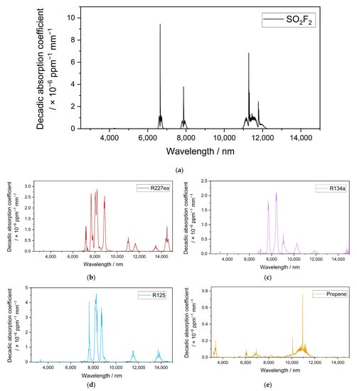 (a) Decadic absorption coefficient spectrum of SO2F2 between 2500 and 15,000 nm and the decadic adsorption coefficient spectra of the possible substituents R227ea (b); R134a (c) []; R125 (d) and propene (e) in standard conditions.