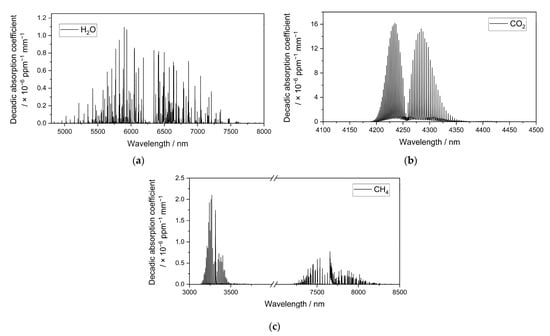 Figure 4 shows the decadic absorption spectra of the possibly interfering atmospheric gases H2O, CO2, and CH4, which were calculated and plotted using the HITRAN database [].