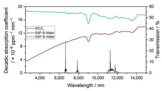 The infrared transmission through 500 µm of SSP Si and 500 µm of DSP Si and the spectrum of SO2F2 in the wavelength range between 2500 and 15,000 nm are shown in Figure 5. The infrared transmission through DSP Si was higher than the transmission though SSP Si. The average infrared transmission through DSP Si was about 52 % in the wavelength ranges where SO2F2 absorbs.