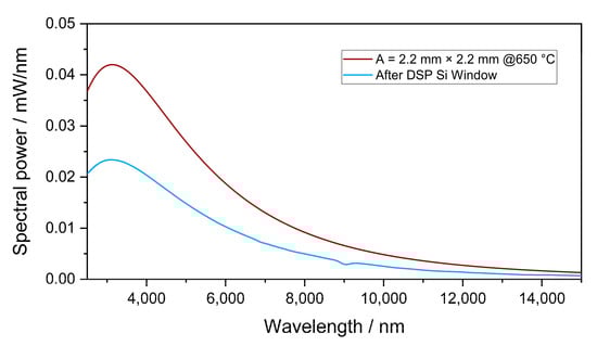 Simulated emitted spectral power of the infrared emitter with an emitter temperature of 650 °C and an active area of 2.2 mm × 2.2 mm and the transmitted spectral power through DSP Si.