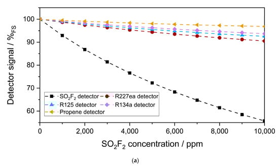 The simulated sensitivity of each photoacoustic detector to 0–10,000 ppm SO2F2 in the absorption cell (50 mm length) is plotted in Figure 7a. As expected, the highest sensitivity was obtained with the SO2F2 detector. Among the substituents, R227ea showed the highest sensitivity to SO2F2. Although R125 absorbed stronger than R227ea, R134a, and propene between 10,500 and 12,200 nm, the absorbance of R227ea between 7700 and 8100 nm was higher than those of R134a, R125, and propene, and the spectral power transmitted through the detector between 7700 and 8100 nm was three times higher than that between 10,500 and 12,200 nm. For this reason, the R227ea detector was more sensitive to SO2F2 than the other detectors. The propene detector showed the lowest sensitivity to SO2F2, which can be explained by its weak infrared absorption compared to the other substituents in the considered wavelength range. Moreover, the relative signal change of the SO2F2 detector versus the SO2F2 concentration change in the absorption cell was not linear, while that of the refrigerant detectors was.