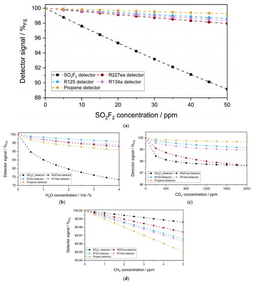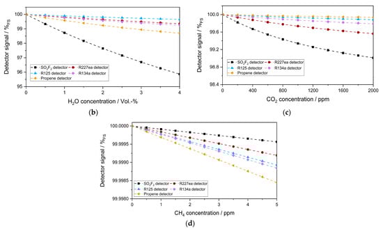 Figure 8a shows the simulated sensitivity of each photoacoustic detector to 0–50 ppm SO2F2 in a long-path absorption cell (1.6 m optical path length). In these simulations, only the concentrations of SO2F2 and the optical path length were changed. Everything else was kept as in the previous simulations. Therefore, R227ea still showed the highest sensitivity to SO2F2 among the substituents. Moreover, the relative signal change of the SO2F2 detector as a function of the SO2F2 concentration change in the long-path absorption cell became linear, like that of the refrigerant detectors. The cross-sensitivity of the photoacoustic detectors to 0–4 Vol.-% H2O and 0–2000 ppm CO2 also became more critical in this case (Figure 8b,c), while the cross-sensitivity to 0–5 ppm CH4 was still low and negligible (Figure 8d).