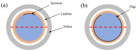Prior to the refractive surgery, ophthalmological examinations were performed on the rabbits using ultrasound pachymetry, a slit-lamp, Covis-ST, and Pentacam corneal topography to determine whether they met surgical requirements. According to the incisions of SMILE and FLEx, an experiment protocol was designed to accurately assess the differences in corneal biomechanical properties, as shown in Figure 1. The red dotted line shows the imaging area, and the black solid arc is the incision made in the SMILE surgery and the corneal flap in the FLEx surgery.