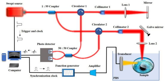 The acoustic radiation force based OCE system diagram. The swept laser with a central wavelength of 1310 nm is split by a 1:99 optical coupler and then enters the reference arm and the sample arm, respectively, and the interference signal is detected by an optical balance detector. The laser provides the sampling trigger signal and sampling clock signal. The synchronization control signal of the acoustic radiation force excitation is generated by the computer and synchronized with the OCT sampling clock.