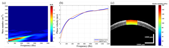 Considering the anisotropic material properties of the cornea, the Lamb wave phase velocity was further used to analyze the biomechanical properties of the cornea. Since the phase velocity depends on the frequency-dispersion relationship, the vibrational curves in the frequency-wavenumber domain obtained by the 2D Fourier transform of the spatial-temporal displacement are shown in Figure 4a, and the phase velocity of the Lamb wave was calculated using (Figure 4b). Based on the mapping of the phase velocity, the elastography of the cornea at all available depths can be obtained by repeating the above steps. For each layer of the intact cornea, a central corneal region was selected for depth-resolved elastography (Figure 4c) by repeating the above program. The elastic modulus of the cornea decreased from the anterior stroma to the endothelium, with a range of 149–86 kPa, which was consistent with the results of OCE and ultrasonic elastography [30,31]. The maximum elastic modulus of the intact cornea was 144 ± 5 kPa in the anterior stroma and the minimum value was 89 ± 3 kPa in the endothelium.