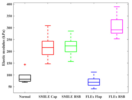 Figure 7 shows the statistical results of elastic modulus of the normal cornea, corneal cap/flap, and RSB before and after the FLEx and SMILE surgery. For the normal cornea, the average elastic modulus was 91.7 ± 28.1 kPa. For the FLEx group, the average elastic modulus of the corneal flap and RSB were 71.7 (±24.6) kPa and 305.8 (±48.5) kPa, respectively. For the SMILE group, the average elastic modulus of the corneal cap and RSB were 219.5 (±54.9) kPa and 221.5 (±43.2) kPa, respectively. The differences between the SMILE and FLEx groups were statistically significant (p = 1.7 × 10−7).