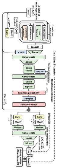 Recently, a meta-learning-based algorithm was proposed that addresses the aforementioned limitations of high computational complexity and approximation. Ren et al. [27] proposed a robust algorithm for low-quality data by adjusting the weight of the batch-size training data for each gradient step using the validation set. Hendrycks [28] corrected the labels of corrupted label data using a clean validation set and re-trained the model using the corrected training data. Saeed [29] used a neural network-based task predictor for image segmentation and classification to update the neural network-based image quality assessment (IQA) controller for medical image data. The authors performed meta-reinforcement learning for newly added data or meta-task data to fine-tune the IQA controller network using the task performance of the predictor. Yoon [30] proposed a deep learning-based data valuation algorithm using reinforcement learning by combining a predictor with a data value estimator (DVE). The DVE was trained using meta-reinforcement learning using the task performance of the predictor. This method exhibited better performance and efficiency than LOO [25] and Data Shapley [26]. Previous data valuation algorithm studies [26,29,30] primarily dealt with public image datasets and insufficiently dealt with other types of data, such as time series data and data with a small number of samples.