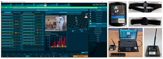 Noraxon’s myoMotion, which is a multichannel wireless IMU system, is used for the experiment. This system is certified to be an ISO 13,485 compliant (Registration # MED−0037b) and an FDA 510 K compliant (Registration number #2098416) medical device. IMU modules are attached to the human body using Velcro bands. The IMU modules transmit data wirelessly to receivers, which are connected to a computer via a USB. The system uses a type of PC software for recording and management hardware. If a webcam is connected to the PC, video data synchronized with IMU data can be recorded, which can be used to label IMU motion data. Figure 2 illustrates the software and equipment of the Noraxon’s myoMotion.
